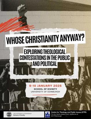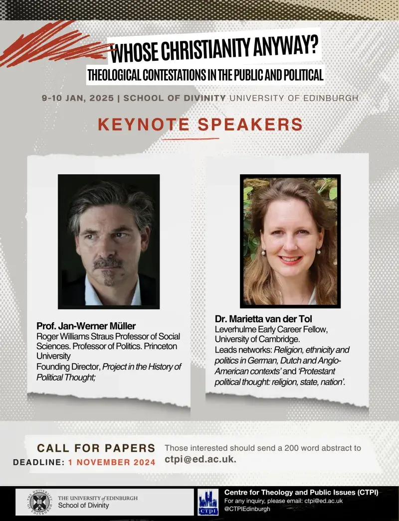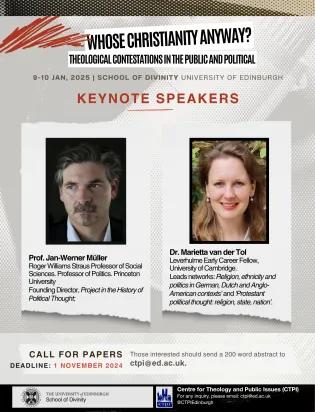 Whose Christianity Anyway? Theological Contestations in the Public & Political: Academic Conference Keynote Speakers:Marietta van der Tol, Leverhulme Early Career Fellow at the University of Cambridge.Jan-Werner Müller, Roger Williams Straus Professor of Social Sciences and Politics, Princeton University.ABSTRACTIt is unmistakable that within the last few decades, rather than religion disappearing from public life, there has been a sharp rise in the number of political and societal actors who claim religious affiliation. From politicians and political parties to terror organisations, claims are made to not only what religion is, but who are the custodians of the faith. Responses from across the humanities have considered the role religions play in these public declarations of religious affiliation, but regularly fall short of fully encompassing the depth and breadth of these theologies--implicit or otherwise. While it may seem that the responses from across sociology, political science, and legal studies are succeeding in addressing the role of Christianity in particular, in political and social movements, there is a chasm between these studies and Christian theology more generally, leading to incomplete or failed analysis. This conference seeks to explore two deeply interconnected issues. The first concerns the claims to Christianity made politically, culturally, socially by those in the public sphere and the challenge this poses for theologians and churches. The second is what role theology ought to play in addressing or analysing these claims to Christianity alongside our colleagues in the wider humanities. This conference invites reflections from across various fields in the humanities on both issues, including the claims made about the relationship between Christianity and so called established categories like ‘nation’, state’, ‘culture’ and ‘ethnicity’. We also invite reflections on comparisons between European and non-European claims to Christianity within a political or social context, and wider reflections on how theology should consider future approaches both collaboratively and individually to address and tackle socio-cultural and political claims to Christianity in the 21st Century. The following prompts may help guide prospective attendees regarding submission of abstracts: What sort of claims are being made for Christianity in the public and political spheres? In what ways do non-European claims to Christianity differ from European claims being made by politicians and this win the public sphere? What theological responses have been made to challenge these claims, and how effective have they been?What role does theology have working alongside other fields in the humanities looking ahead into the future? Jan 09 2025 - Jan 10 2025 Whose Christianity Anyway? Theological Contestations in the Public & Political: Academic Conference CTPI is thrilled to support the upcoming conference in 9-10 January 2025, led by graduates of the School of Divinity. New College, School of Divinity University of Edinburgh