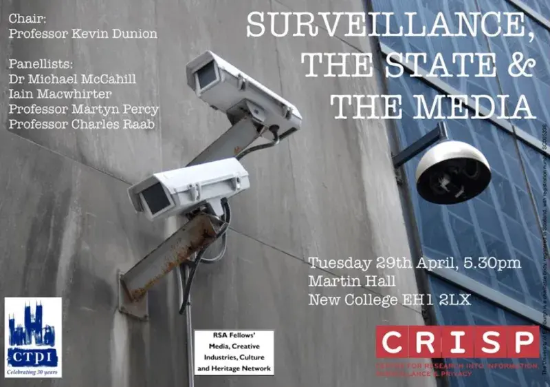 A panel discussion on Surveillance, the State and the Media. Another exciting upcoming event: a panel discussion on Surveillance, the State and the Media on Tuesday 29th April at 5.30pm, here at New College. All are welcome, and you need to register for a free ticket here: http://surveillance29april.eventbrite.co.ukThis event is organised by the RSA Fellows Network and jointly sponsored by the Centre for Research into Information, Surveillance and Privacy, and the Centre for Theology and Public Issues. This article was published on 2024-03-19