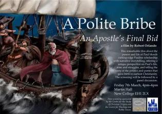 You are invited to the screening of the film A Polite Bribe, followed by a panel discussion. Date: Friday 7th, March, 2014.Place: Martin Hall, School of Divinity, University of Edinbrugh.A Polite Bribe: An Apostole's Final Bidby Robert OrlandoThis remarkable film about the person and life of Paul blends cutting-edge Pauline scholarship with narrative storytelling, offering a unique perspective on Paul’s life, aims and struggles, and telling the story of the politics and parties that gave birth to earliest Christianity. This article was published on 2024-03-19