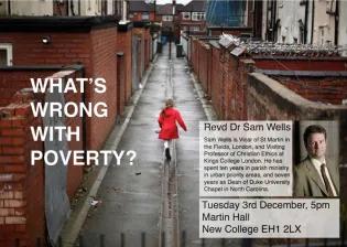 Join us for a public lecture by Revd Dr Sam Wells. What’s Wrong with Poverty? Join us for a public lecture by Revd Dr Sam Wells, on Tuesday 5th December at 5pm in the Martin Hall, New College.Sam Wells is vicar of St Martin in the Fields, London, and Visiting Professor of Christian Ethics at Kings College London. He has spent ten years in ministry in urban priority areas and was for seven years Dean of Duke University Chapel in North Carolina. This article was published on 2024-03-19
